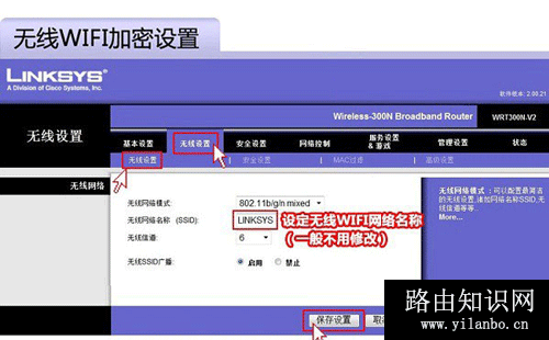 4、接着再点击导航条上的“无线设置”,然后在无线Wifi加密设置中,设定一个Wifi无线网络名称,这个名称可以默认,也可以修改名称,以后就可以搜索到这个名称的WiFi无线网络,然后点击底部的“保存设置”。
