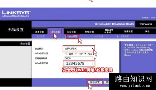 5、接下来,点击顶部导航条无线设置下面的“安全设置”,是设置Wifi无线密码,为了防止被周边用户蹭网,将安全模式设置为WPA-PSK2,为了防止被蹭网,强烈建议大家将这个密码设置为复杂一些,不过请用户牢记密码,以后使用无线网络都需要用到,设置完了,同样不要忘记了点击底部的“保存设置”。