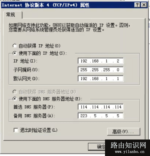 5、在“Internet 协议版本 4 (TCP/IPv4) 属性”窗口选中“使用下面的IP地址,按照下图填写上去,点击确定。