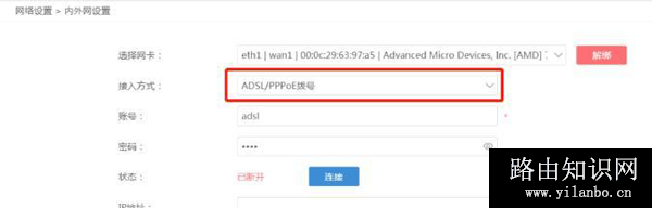 9、绑定网卡后,根据用户的网络选择“接入方式”,一般都是“ADSL/PPPOE拨号”,然后填写宽带的帐号与密码,点击“保存”,就成功设置完成了,用户稍等几分钟,就可以使用了。